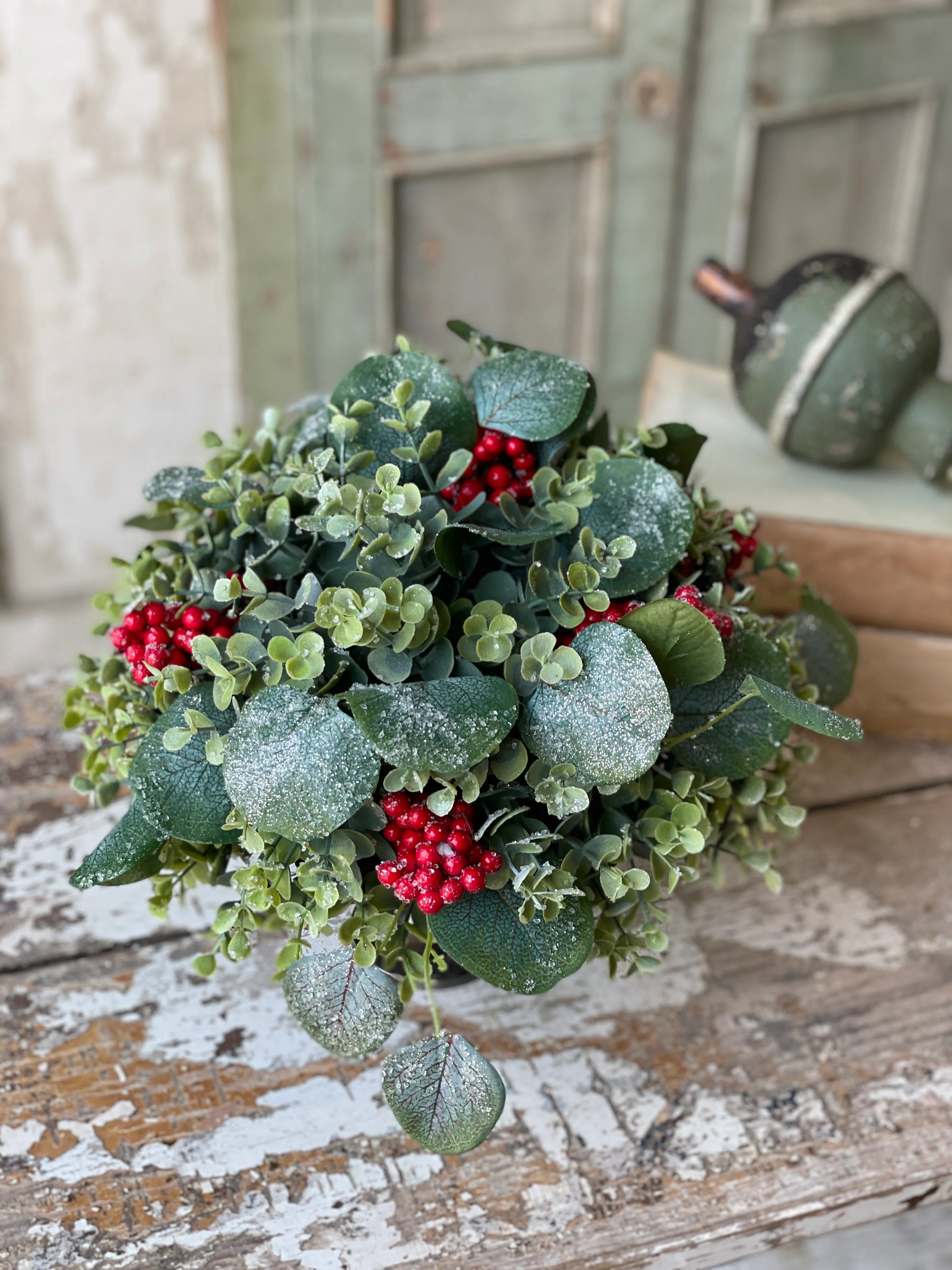 Celebrate the holiday season with this sophisticated Harlequin Eucalyptus Half Sphere. Featuring a beautiful mix of eucalyptus leaves paired with striking red berry clusters, each leaf is delicately topped with small ice chips and a subtle glitter finish. This arrangement brings a refined, festive touch to your décor, combining natural elegance with seasonal sparkle.