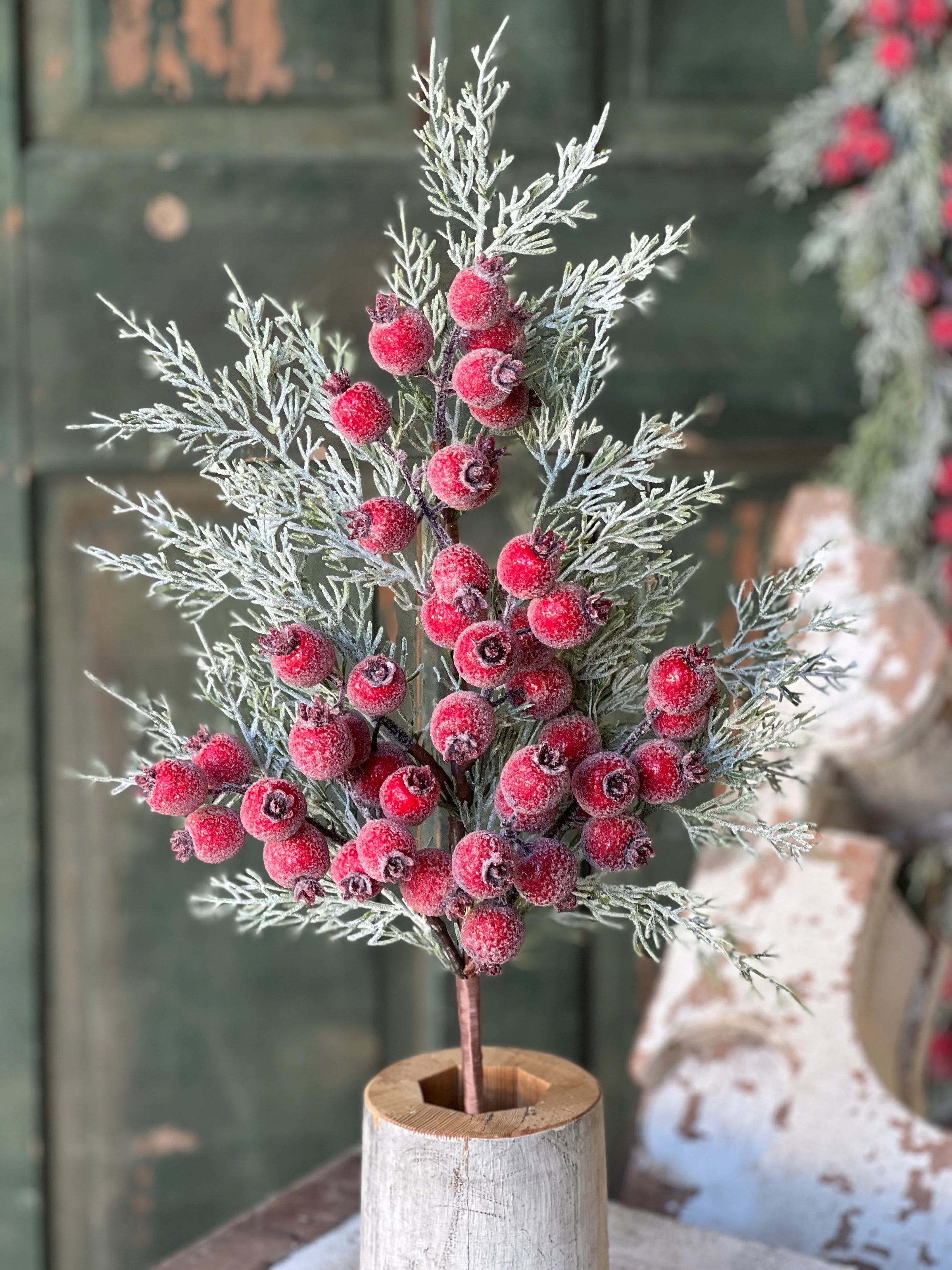 Lovely frosted greenery sets the stage for sugared berries and composes a collection that is heavy on wintery charm.