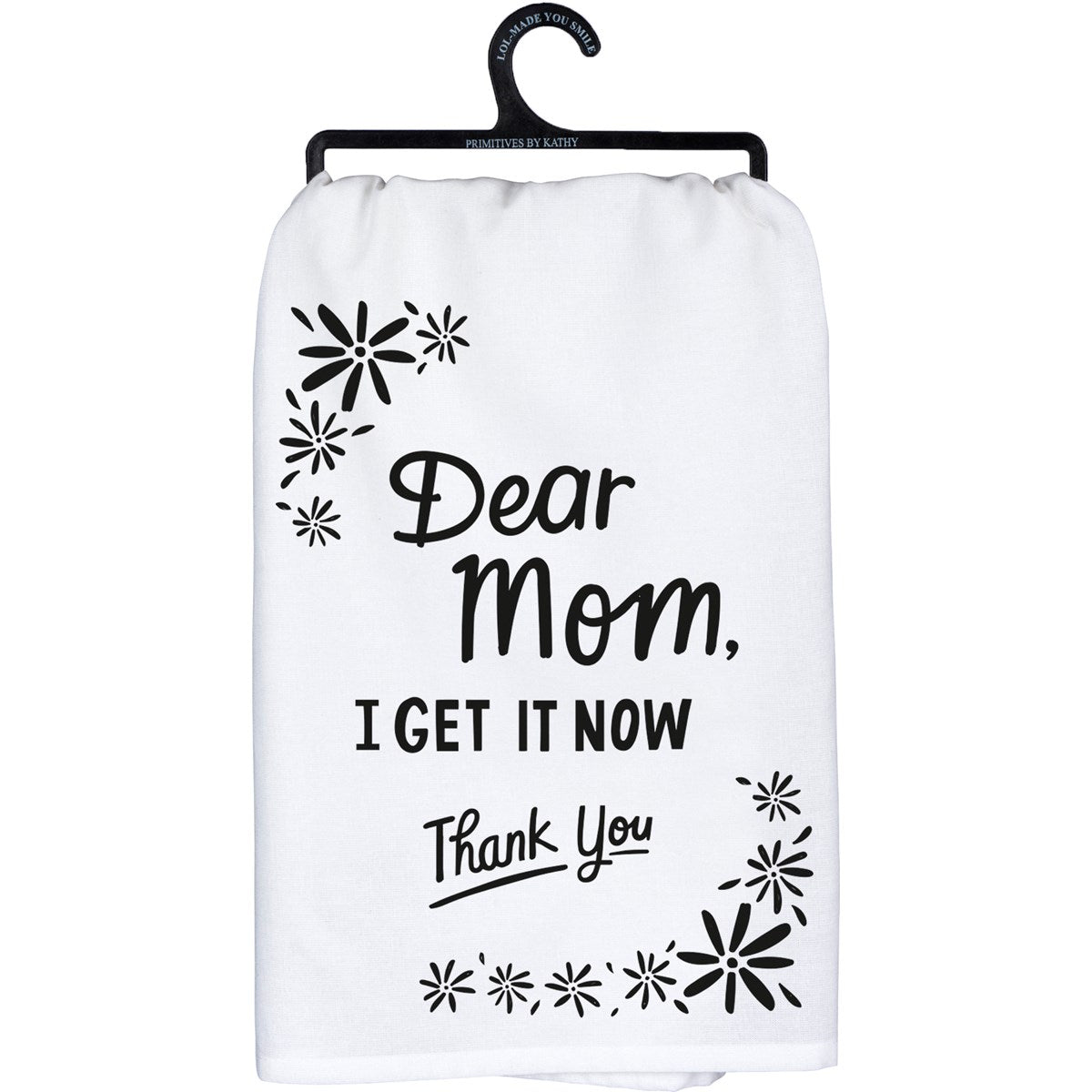 A black and white cotton dish towel featuring a "Dear Mom, I Get It Now - Thank You" sentiment with floral designs. Machine-washable.