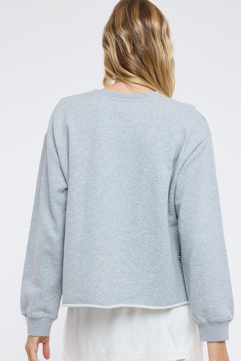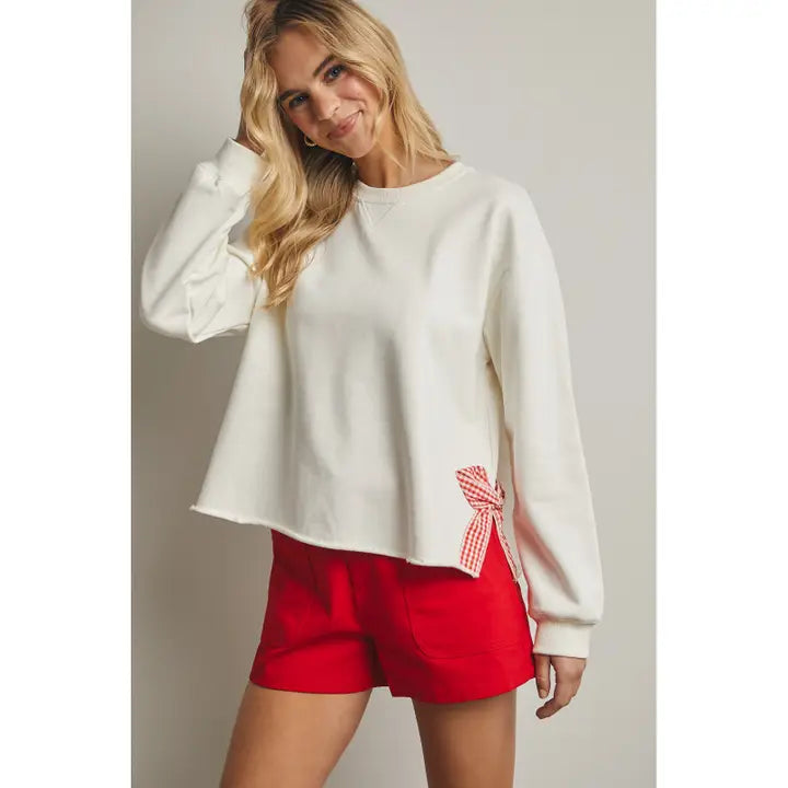 A cozy pullover featuring a charming gingham bow detail at the side. Long sleeves and a relaxed round neckline make it perfect for casual everyday wear. The side slit adds a touch of style while keeping comfort front and center.