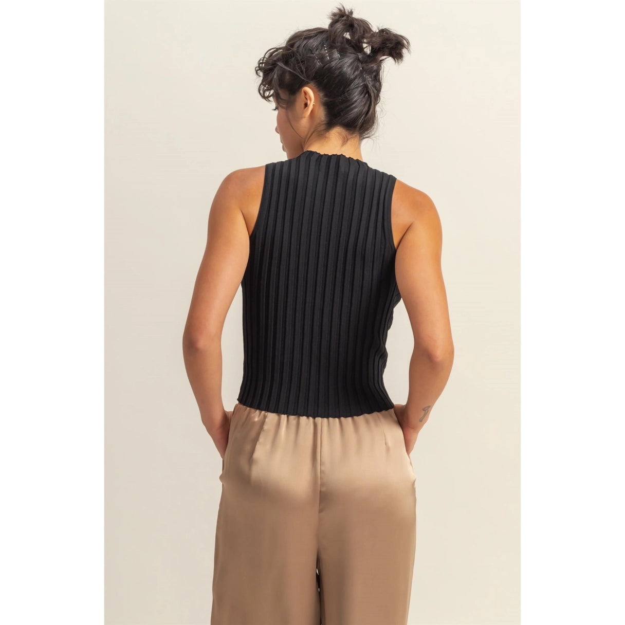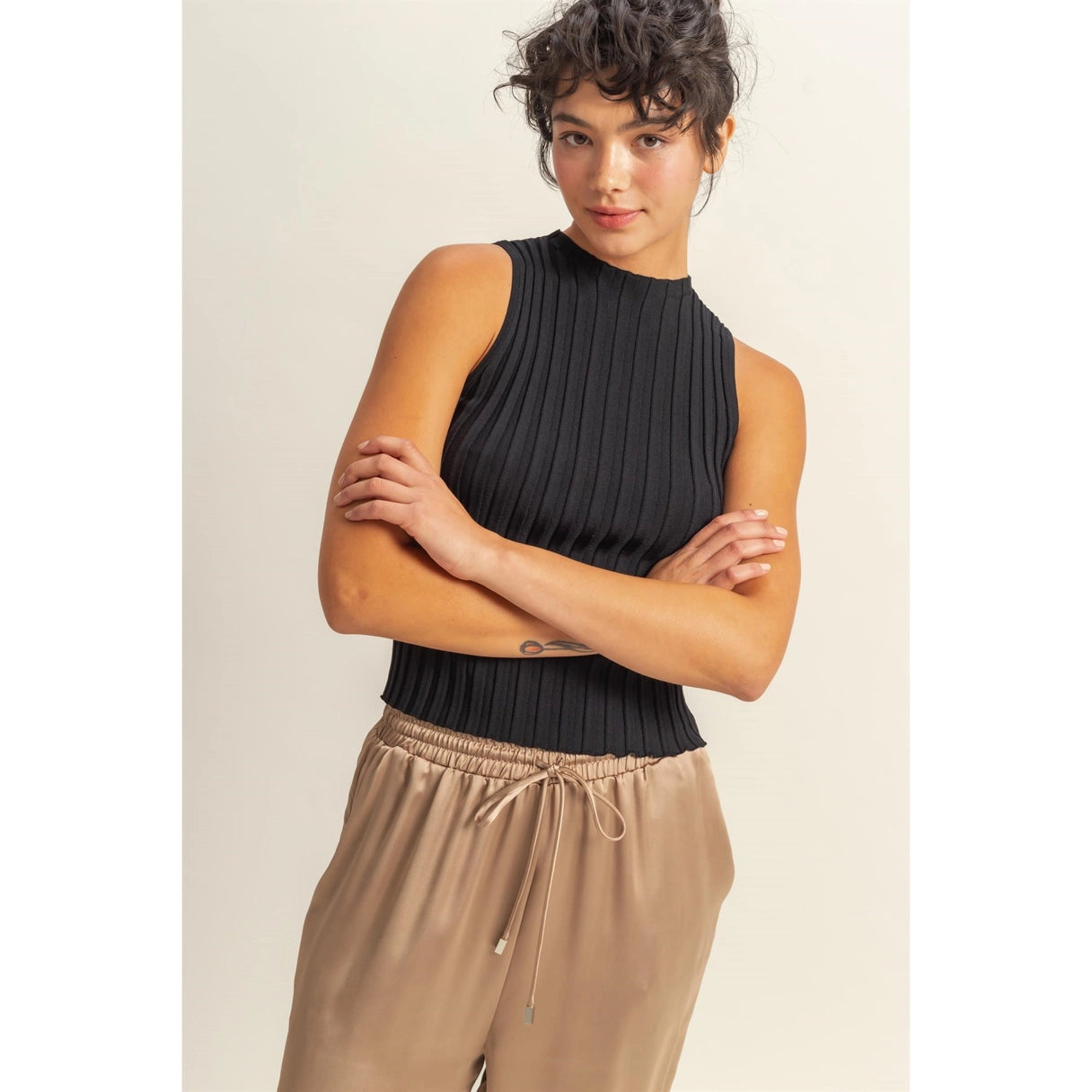 Enhance your curves in the Ribbed Mock Neck Top. This sleeveless top features a ribbed construction for a figure-accentuating fit. The mock neck adds a touch of elegance, while lettuce edges add a chic detail. Perfect for layering. Get ready for compliments!