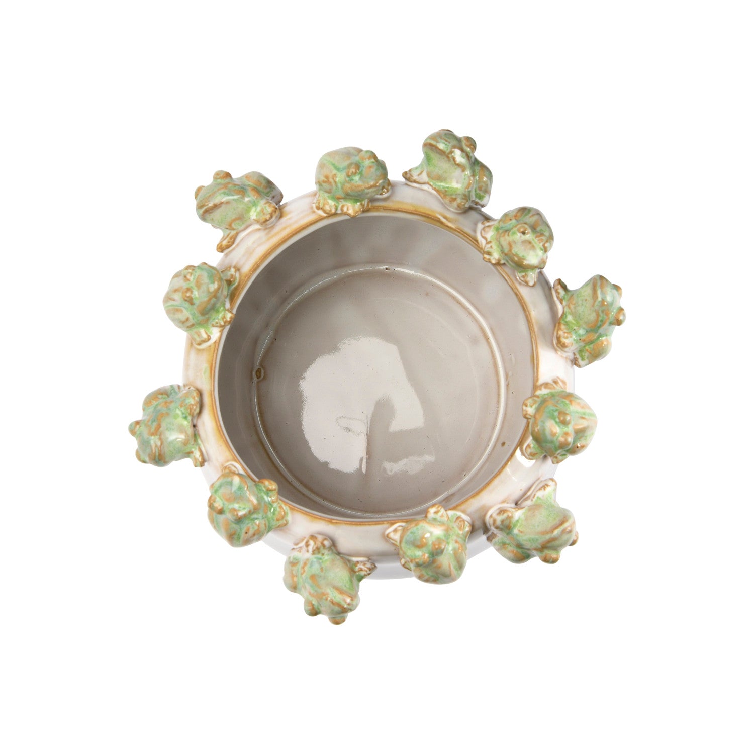 This handmade stoneware planter is crafted with a unique reactive glaze, giving it a distinct white and green finish. The rim is decorated with stylized frogs, adding a unique touch to your garden. Upscale your outdoor space with this one-of-a-kind Frogs Stoneware Planter. (Each one will vary)