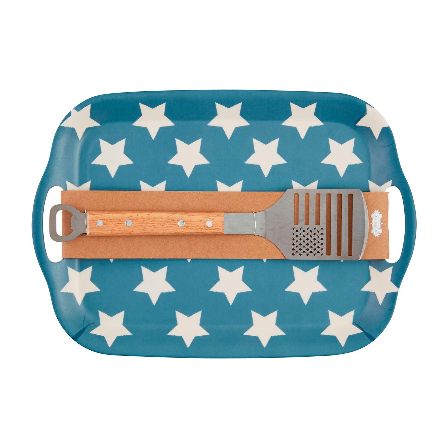 Serve up your patriotism with the Americana Tray Spatula Set! Made from durable bamboo fiber, this serving tray features convenient side handles for easy carrying. And with the included American flag spatula, complete with a bottle opener handle, you'll be the ultimate host for any Fourth of July or Memorial Day celebration.