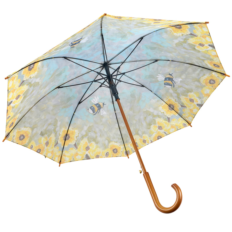 Stay dry and stylish with our Bumblebees Umbrella! Featuring a full color design of buzzing bumblebees over yellow flowers, this umbrella is not only beautiful, but functional. Bumblebee design is replicated from original art created at the Friendship Heart Gallery in downtown Lancaster, PA. Made with a durable curved wooden handle and easy-to-open canopy, it's perfect for everyday use. This umbrella also supports artists with intellectual disabilities and autism.
