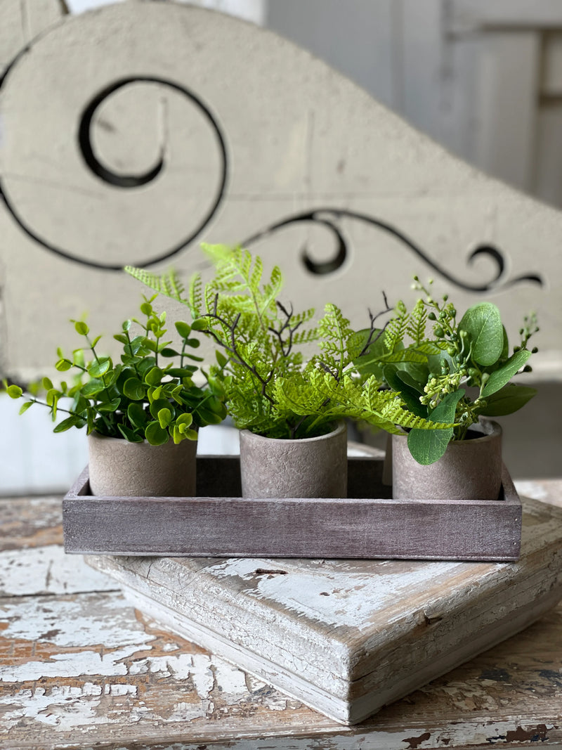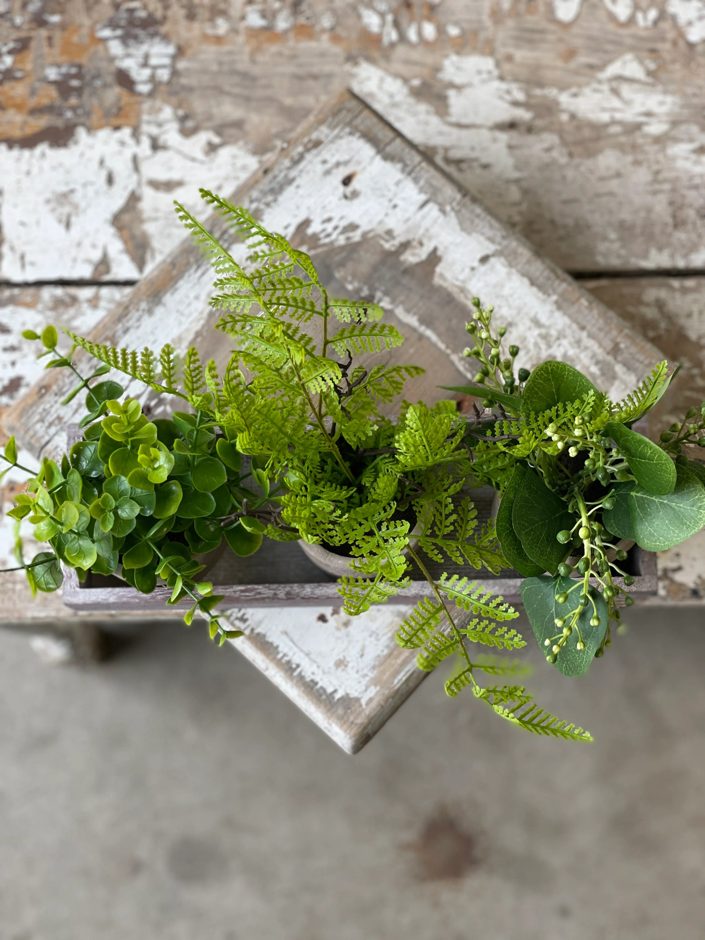 The Carlisle collection is a bounty of greenery! Two varieties of eucalyptus blend together with ferns, seed shoots, and branching accents to form a symphony of greens. The arrangement for this collection features three pots in a wooden tray.