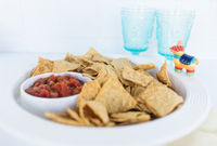 our chip and dip platter is made of high-quality melamine, making it durable and convenient for outdoor use. its functional design makes it easy for small dip containers to fit perfectly into the platter, mess-free!