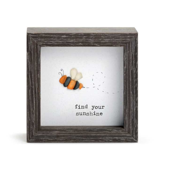 Artist Sharon Nowlan's art is reflective of the beautiful land and seascapes of Nova Scotia, where she grew up drawing, painting and creating in a variety of media. Her pebble art collection, including the Find Your Sunshine Shadow Box, transforms a mix of composite pebbles and other materials into inspirational designs that capture the joy and emotional experience of relationships.