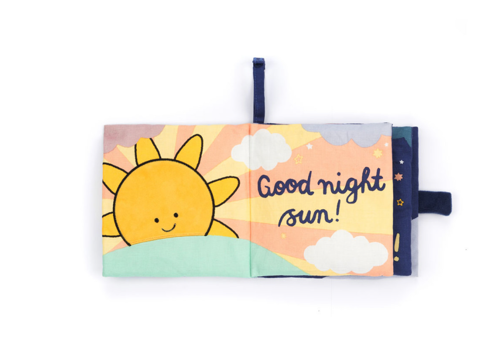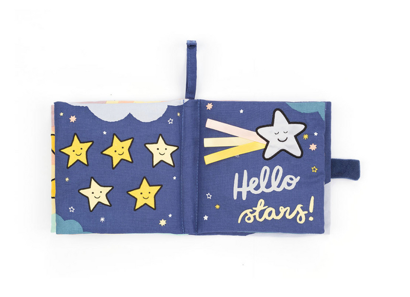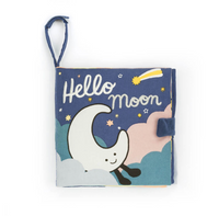 A charming interactive fabric book featuring Amuseables Moon with bold, colorful illustrations. Printed on cotton, with crinkle pages, applique texture detail and a mirror on the last page to delight young babies. Fasten this book to the stroller or crib, and let baby explore the night sky!
