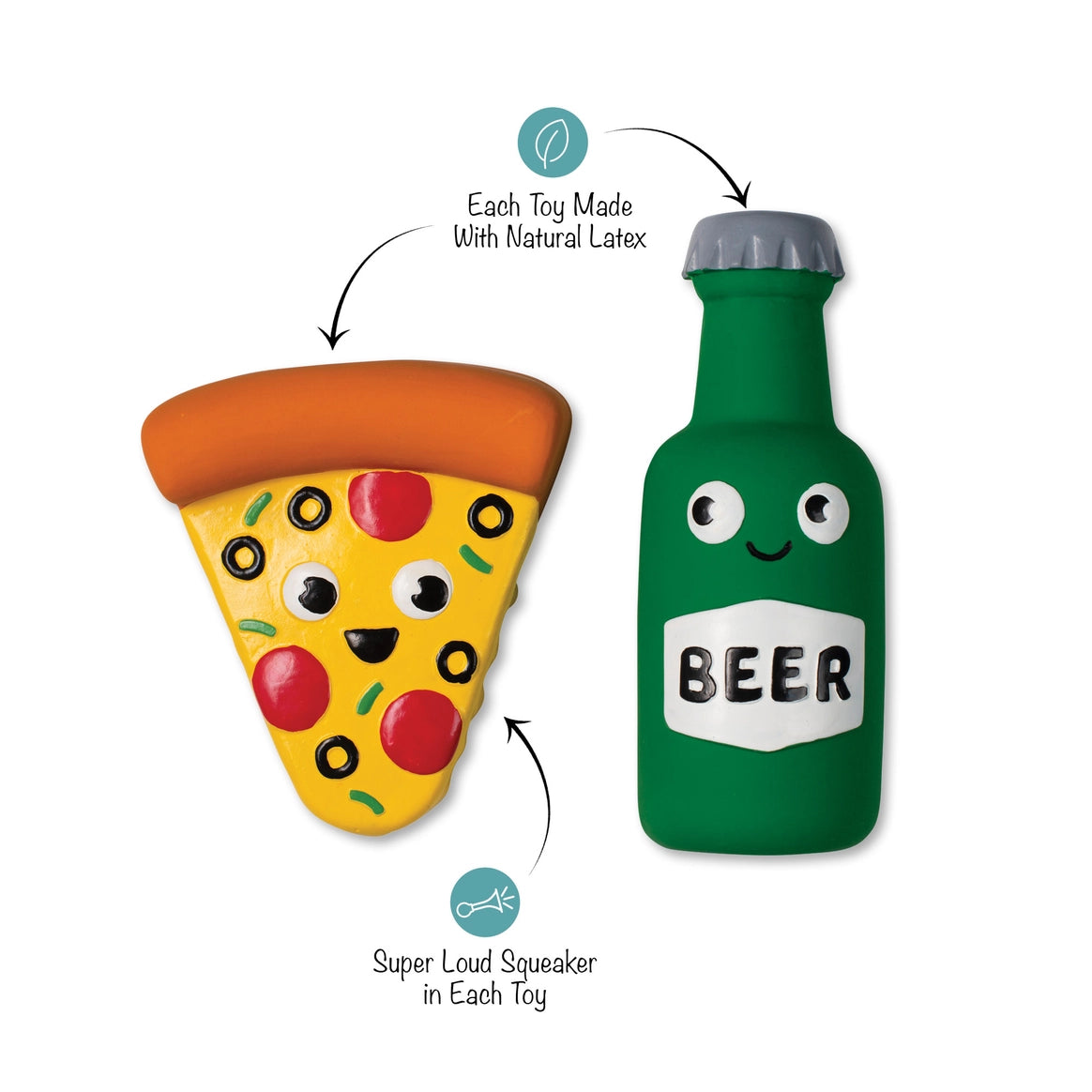 A real pizza work! PetShop by Fringe Studio's “In Pizza We Crust” 2 piece latex toy set is perfect for playtime, anytime. Made with natural latex and a super loud squeaker in each toy, this set was designed with interactive play in mind. Whether you squeak or toss them, your pup will beer-y happy.