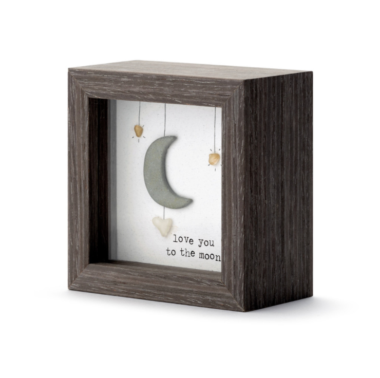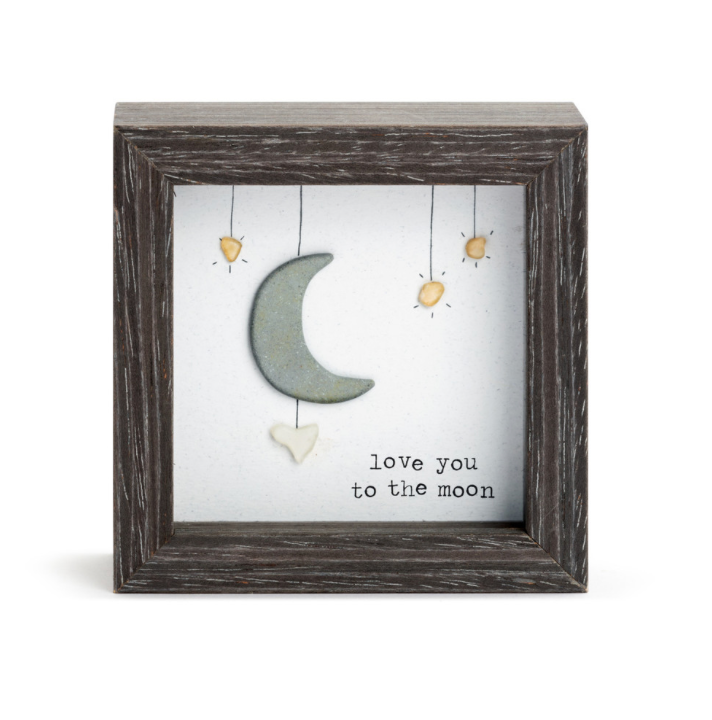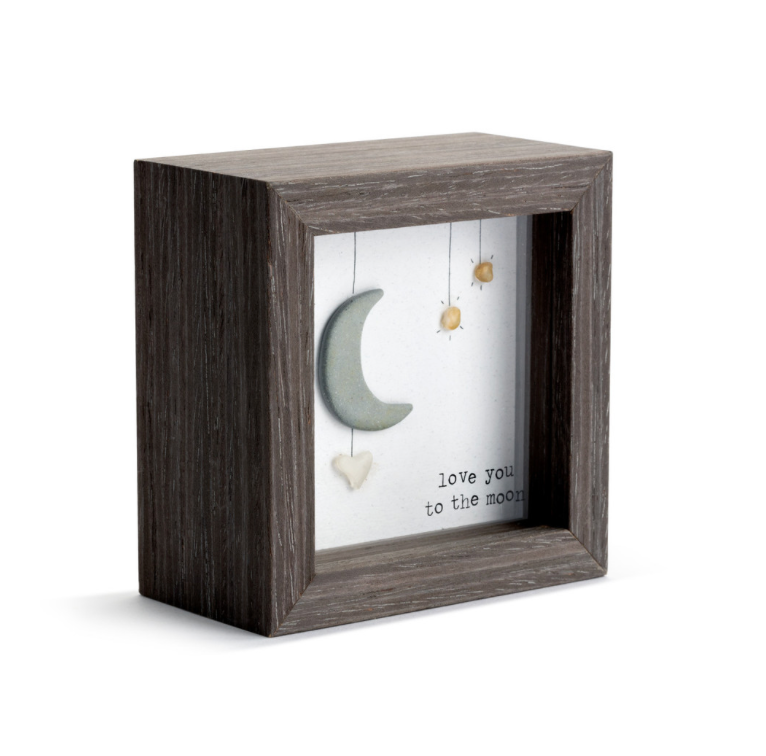 Artist Sharon Nowlan's art is reflective of the beautiful land and seascapes of Nova Scotia, where she grew up drawing, painting and creating in a variety of media. Her pebble art collection, including the Love You to the Moon Shadow Box, transforms a mix of composite pebbles and other materials into inspirational designs that capture the joy and emotional experience of relationships.