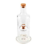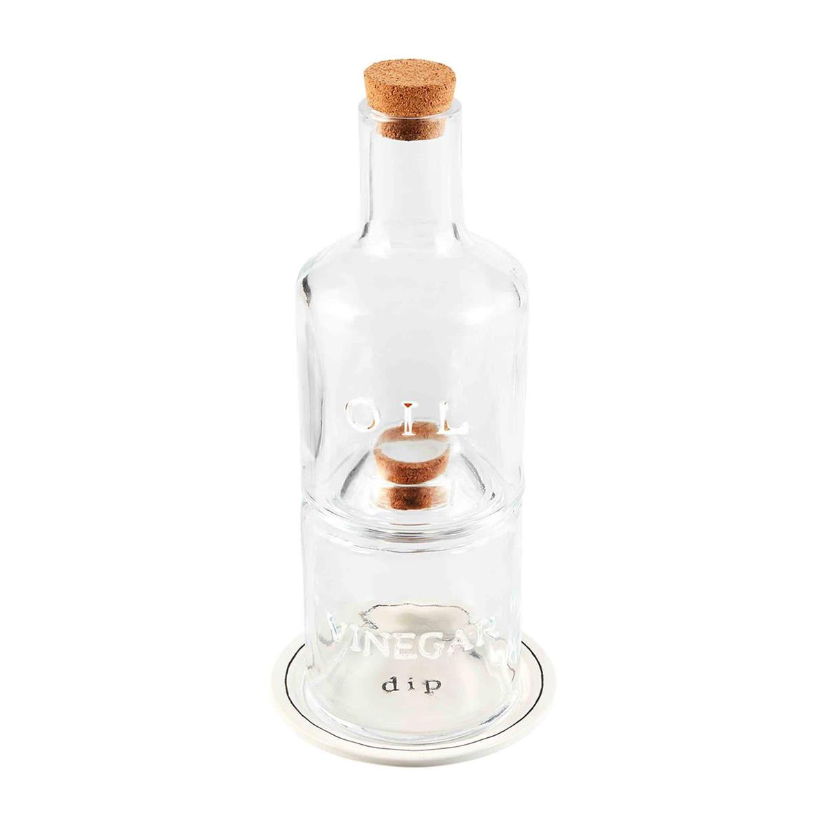 This Stacked Oil and Vinegar Dip Set features an attractive design. The three piece set comes with stacking embossed glass oil and vinegar decanters. The decanters each feature cork stoppers. The oil and vinegar bottles rest on ceramic dipping dish that features the sentiment "dip".