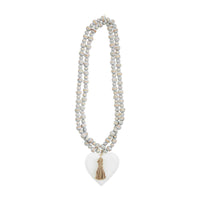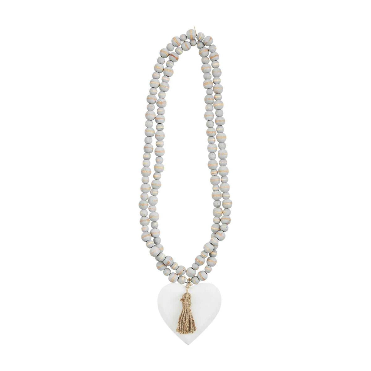 Mango wood beads on jute rope features etched mango wood or marble pendant.
