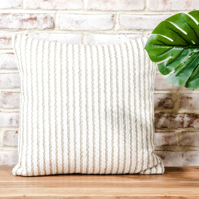 Transform your living space with our Pinstripe Pillow. The subtle beige color adds a touch of warmth and elegance to any room. Experience the comfort and style it brings to your home. Perfect for adding a cozy and inviting ambiance. Elevate your decor with this timeless piece!