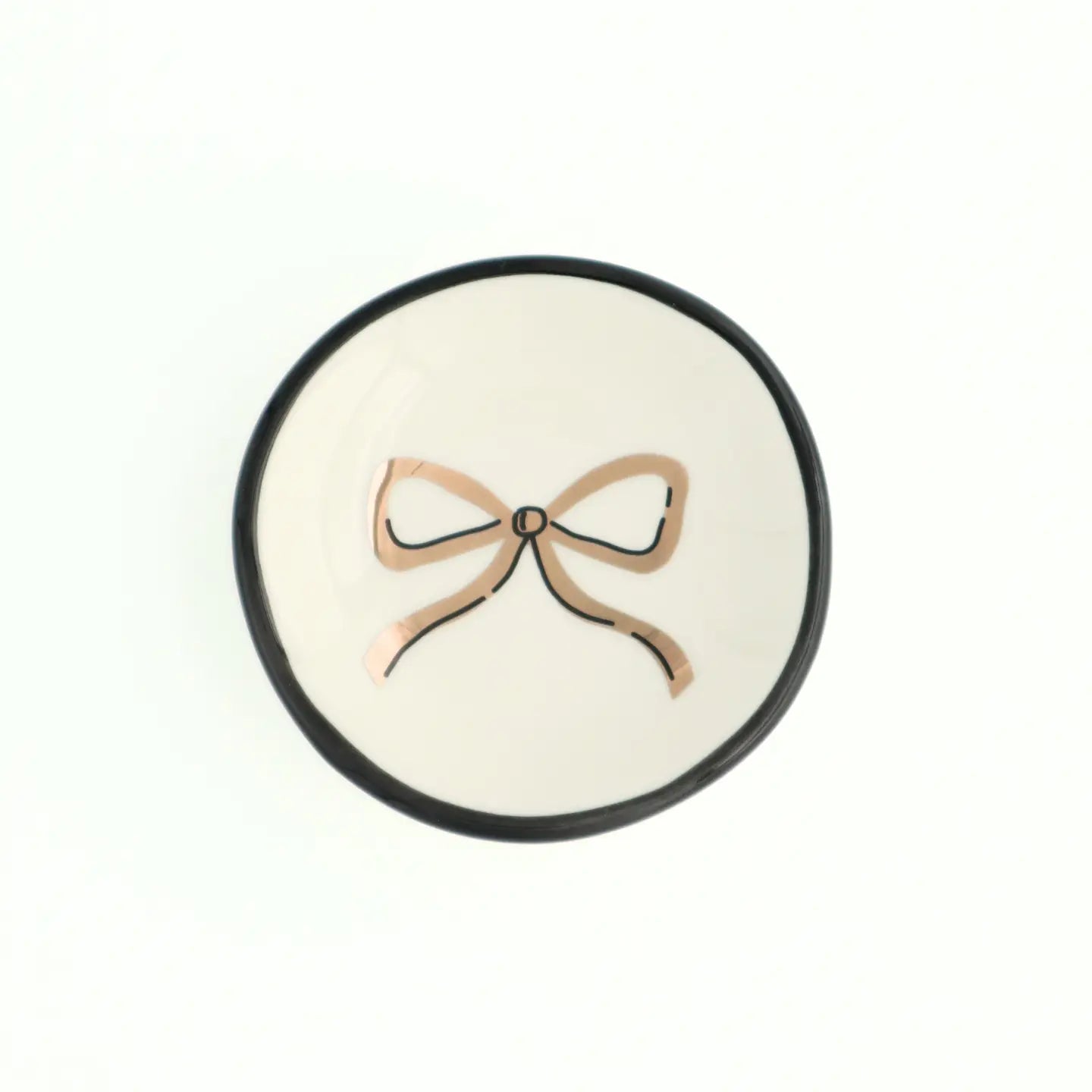 This elegant ring dish features a delicate bow outlined in shimmering gold or black, adding a touch of sophistication to your dresser or nightstand. Perfect for keeping your rings and small jewelry organized, it combines style with practical charm. Elevate your daily routine with this dainty yet functional accessory.