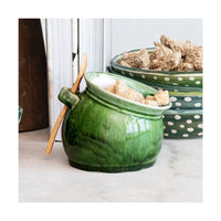 This stoneware salt dish with acacia wood spoon in green is a practical and charming addition to any home. Made of durable stoneware, it is microwave, oven, and dishwasher safe. The reactive glaze finish adds a natural and cozy appearance, while the round shape keeps the salt fresh and dry. The acacia wood spoon is smooth and sturdy, allowing for easy salt scooping and sprinkle. The dish can be used for storing and serving salt, pepper, herbs, or spices, or adding flavor to a table or countertop. It can match any farmhouse, French country, coastal, lodge, or boho style kitchen or dining room. It's a cute and compact serveware that will impress guests and enhance food presentation.