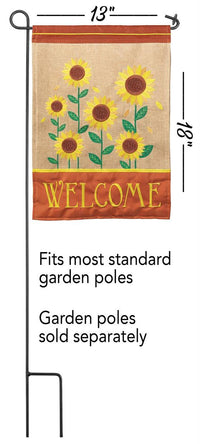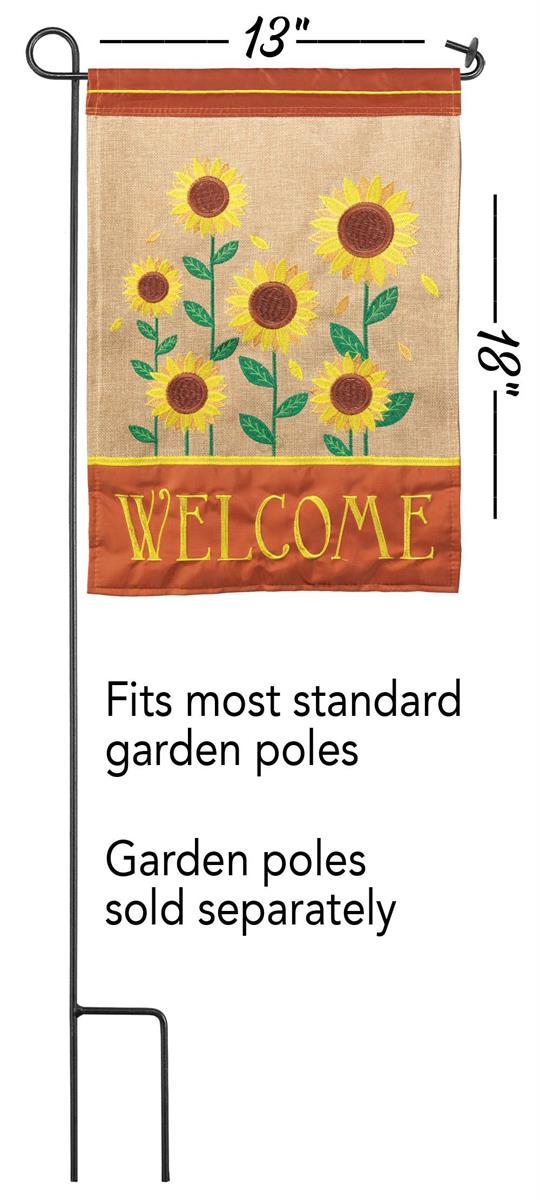 Garden size Double Applique flag is 13 x 18 inches. The design is a combination of fabric appliques and exquisitely detailed embroidery. Design is on both front and back of this 300 denier polyester double thickness flag. These flags are heavier than most others on the market and will hold up longer. Double applique flag fabrics are either satin-smooth or a burlap texture; sometimes a combination of both. Flag will retain its color and beauty for years if displayed in shade or semi-shade, and is rainproof.