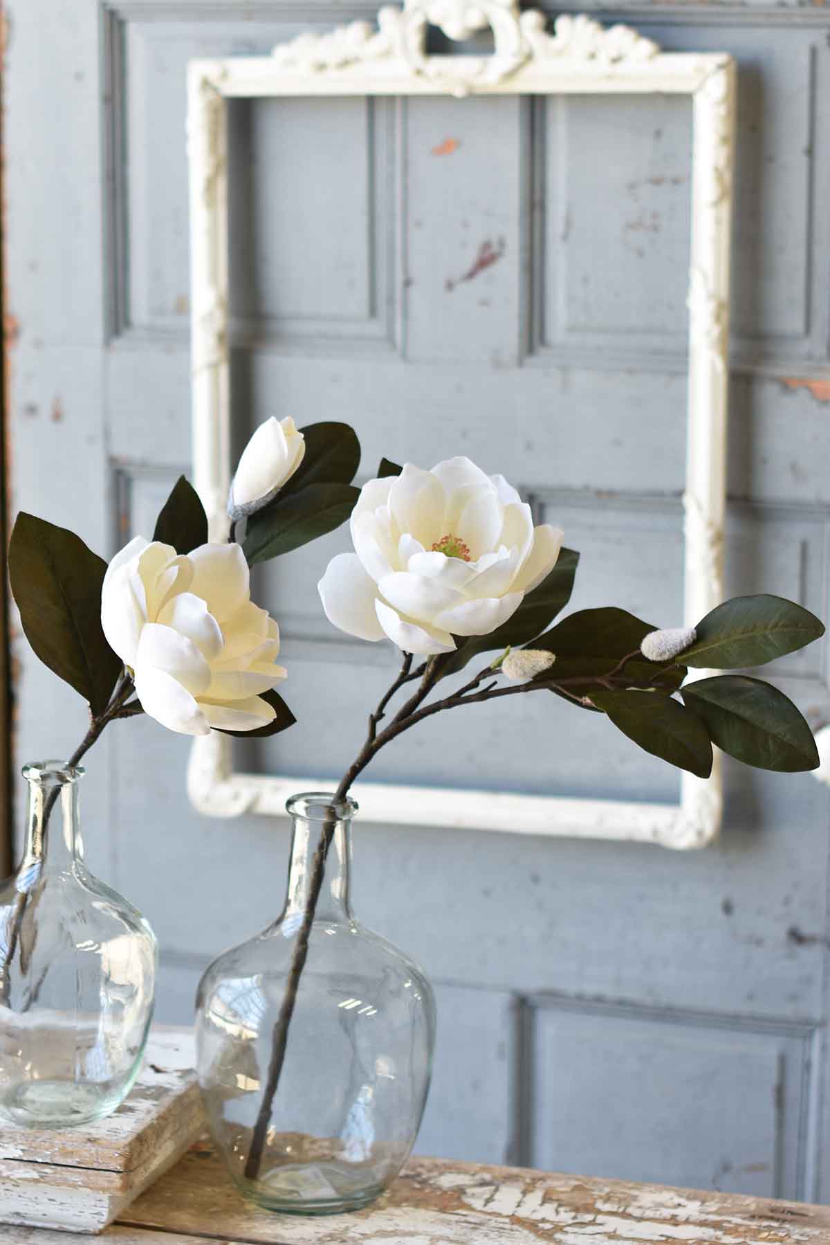 Gorgeous multi-petaled blooms and buds grace stems of magnolia leaves to create a timeless and elegant collection.