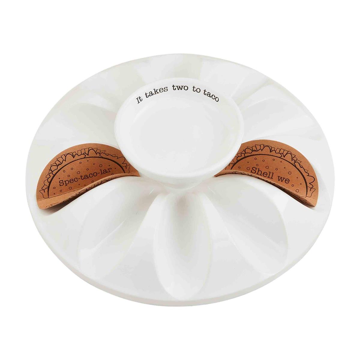Turn taco night into an art form with this perky little platter! Crafted from durable dolomite, it's sure to be the hit of your fiesta. It features grooves to keep those shells upright and a handy dip bowl in the center - you don't want that guacamole to go wasted! Yum! (and tacos, too).