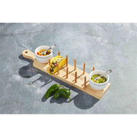 Elevate your taco night with our Taco Stand Set! The wooden paddle board holds tacos upright for easy filling, while the ceramic bowls and silverplate spoons add a touch of elegance. Perfect for hosting or a fun family dinner, this set will make every taco night a fiesta!
