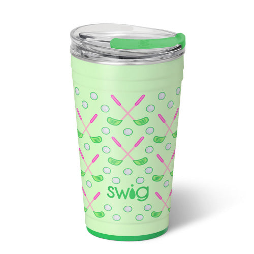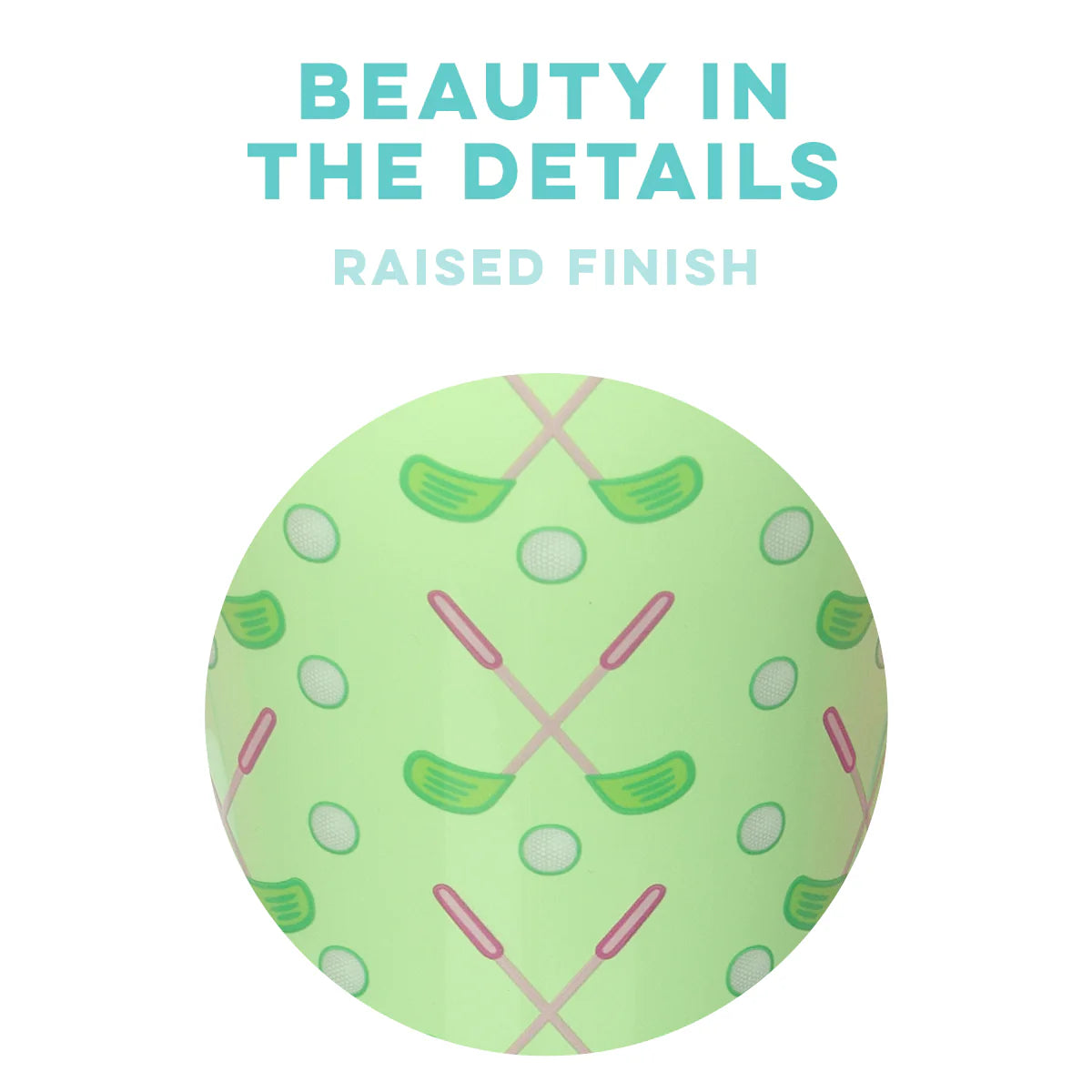 Party-Ready! 🥳🥤 Tee it up in this fun, minty green and pink scene of golf clubs and golf balls.