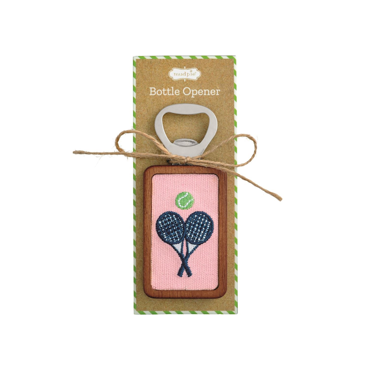 Stainless steel bottle opener with a wooden handle featuring tennis-themed needlepoint embroidery. Durable, stylish, and perfect for any tennis fan.