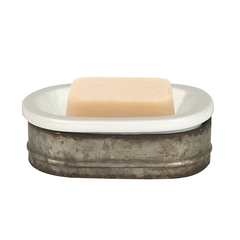 Whether in the kitchen or in the bathroom, this vintage soap dish is perfect for the rustic decor. White porcelain holds the soap and is set in a distressed metal frame.