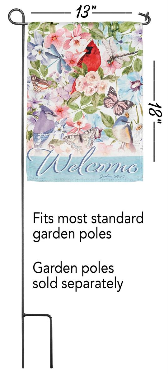 This outdoor flag extends a beautiful springtime welcome with its cheery display of butterflies, flowers and songbirds. Garden size Print flag is 13x18. Design is sublimated to become part of the fabric, not just printed on the surface. Of heavy-duty 650 denier polyester, this flag offers outstanding quality at an affordable price. Flag is single-thickness; design is the same front and back. Light shining through from behind creates a stained glass effect. Flag will retain its color and beauty for years if displayed in shade or semi-shade, and is rainproof.