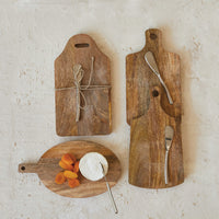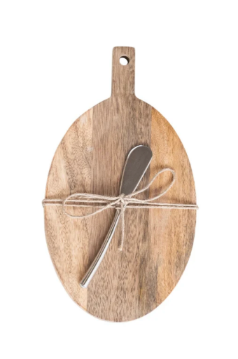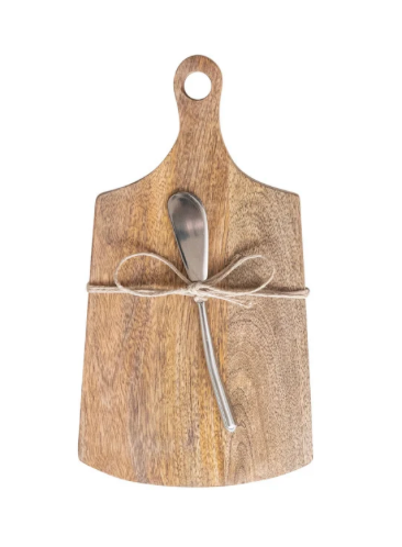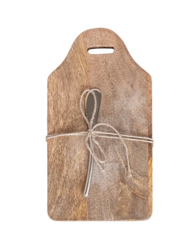 This Mango Wood Cheese/Cutting Board Set is perfect for entertaining! Made with durable mango wood, the set features a convenient handle and includes a stainless steel canapé knife. Available in 4 stylish designs, this set is a must-have for any hosting occasion.